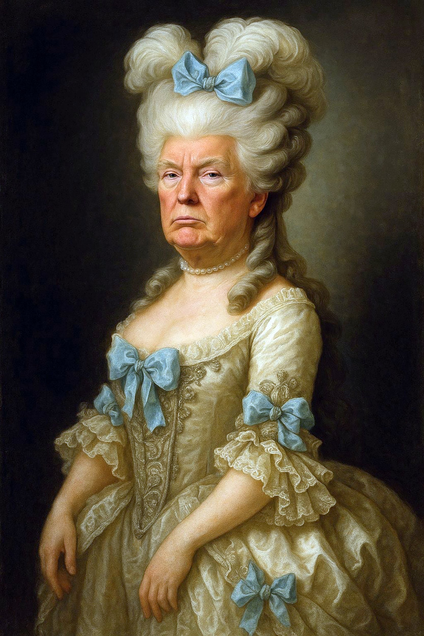Newsom’s press office released a digitally altered portrait of Trump, showing him frowning while wearing an extravagant blue and white dress, complete with a matching blue bow in his voluminous, ringleted grey hair. The image was captioned, “GOOD NIGHT, PEASANTS!”