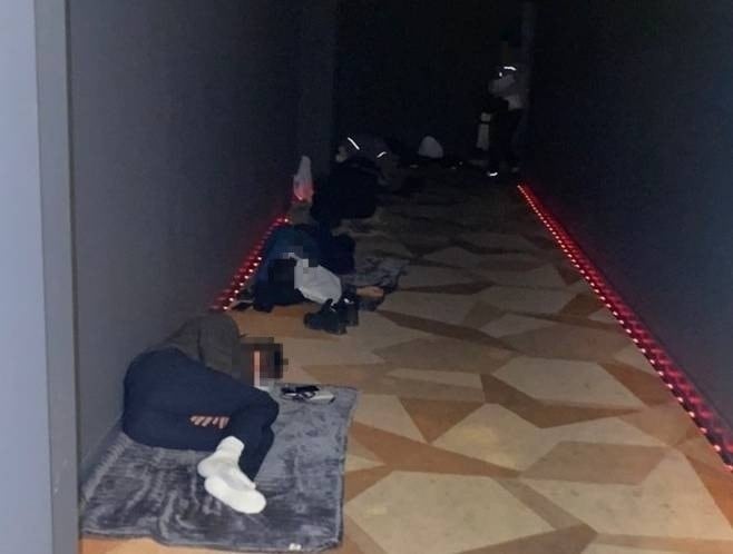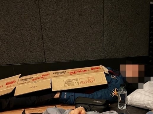 The photographs, released the day before, depict the harsh living conditions endured by police officers at the APEC summit, which concluded on the 1st. One of the most striking images shows a police officer in uniform using a cardboard box as a makeshift blanket to catch a brief nap in a waiting area.